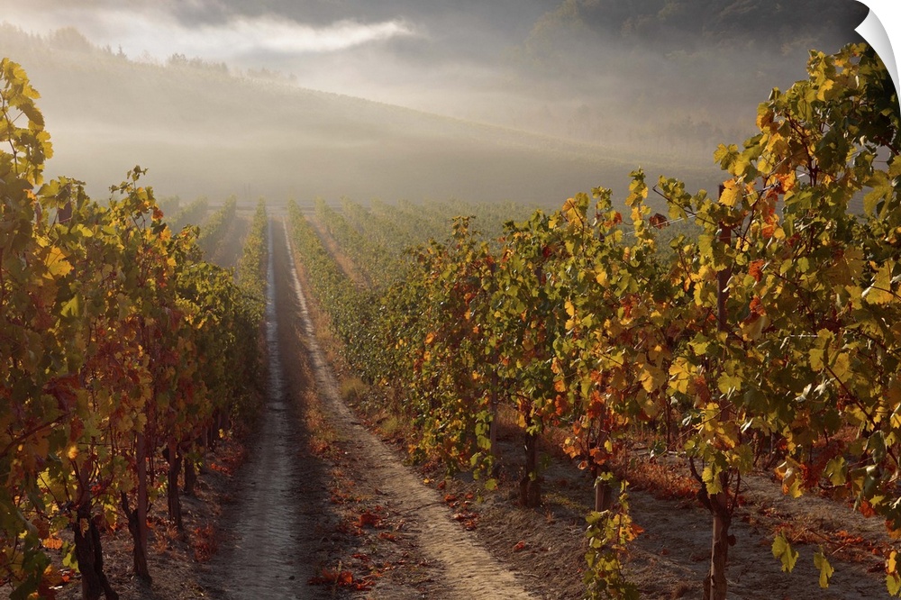 <p>Morning mist over a vineyard in the Piemonte region of Italy.</p>