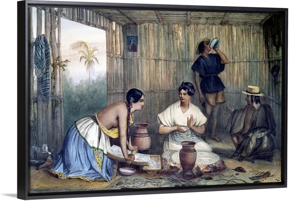 <p>Two Mexican Native Indian women grinding corn on a 'metate' and shaping tortillas. Hand-colored lithograph after a drawing by Don Carlos Nebel.</p>