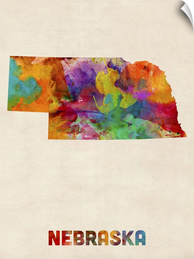 <p>Contemporary piece of artwork of a map of Nebraska made up of watercolor splashes.</p>