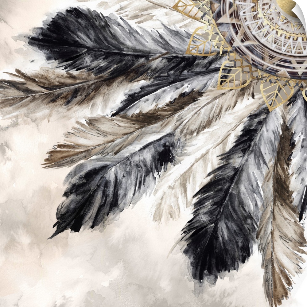 <p>Bohemian mandala with feathers painted in various neutral shades outlined in gold.</p>