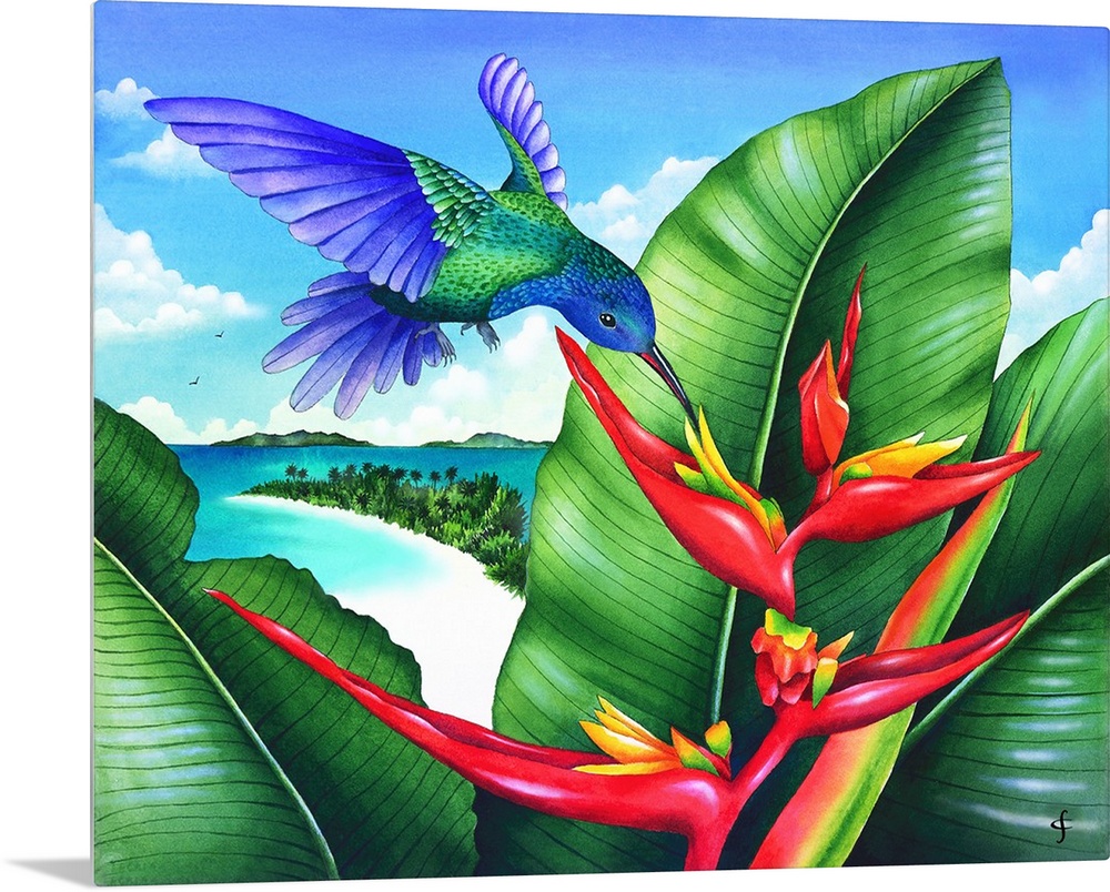 Art Contemporary Art Plants and Flowers Wildlife Florals Tropical Flowers Green Wall Art Painting Carolyn Steele Tropical Watercolor Wildlife Bird Hummingbird Tropical Birds