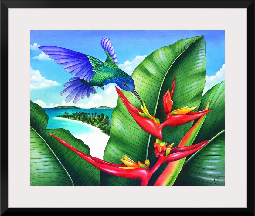 Art Contemporary Art Plants and Flowers Wildlife Florals Tropical Flowers Green Wall Art Painting Carolyn Steele Tropical Watercolor Wildlife Bird Hummingbird Tropical Birds