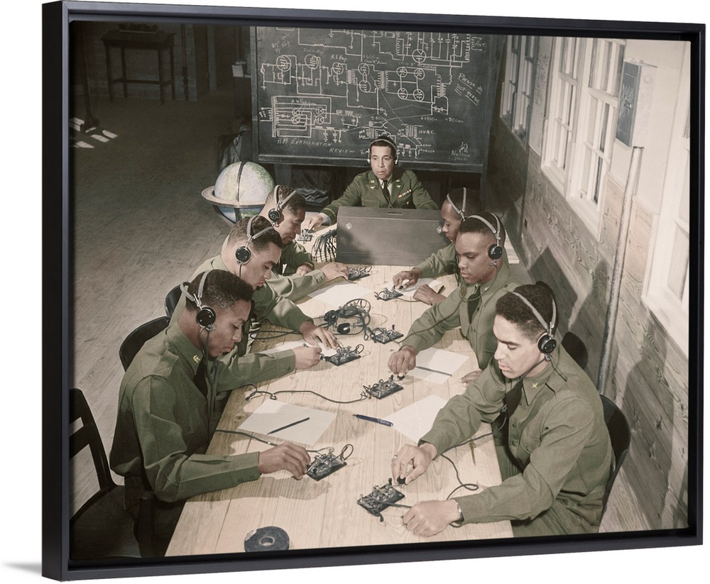<p>Negro Air Corps cadets learning how to send and receive code.</p>