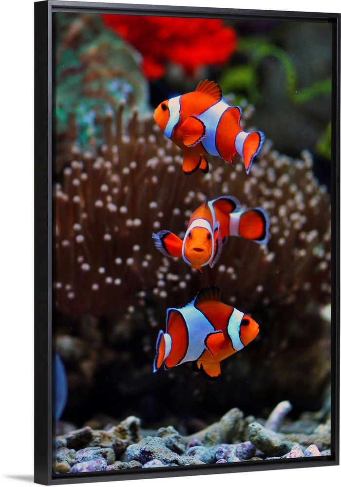 <p>Three orange and white striped Clownfish swimming near anemone.</p>