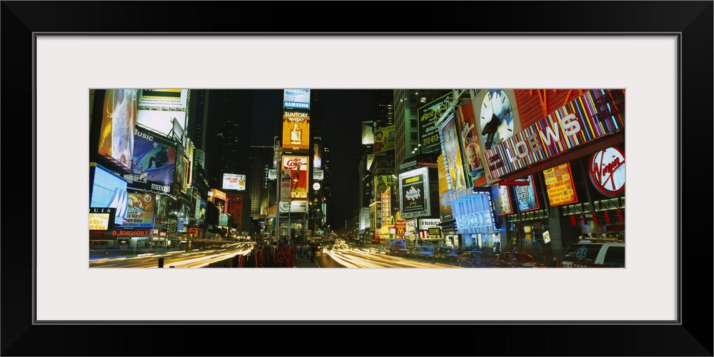 <p>Wide angle photograph of Times Square in New York City, brightly lit at night.</p>
