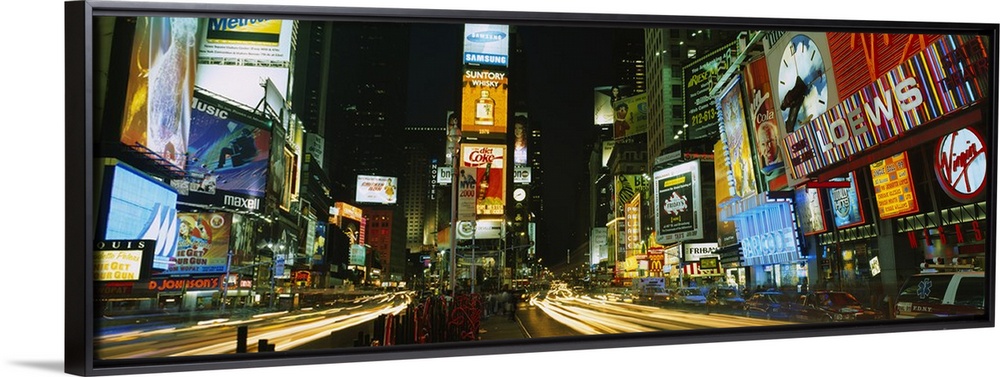 <p>Wide angle photograph of Times Square in New York City, brightly lit at night.</p>