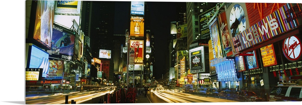 <p>Wide angle photograph of Times Square in New York City, brightly lit at night.</p>
