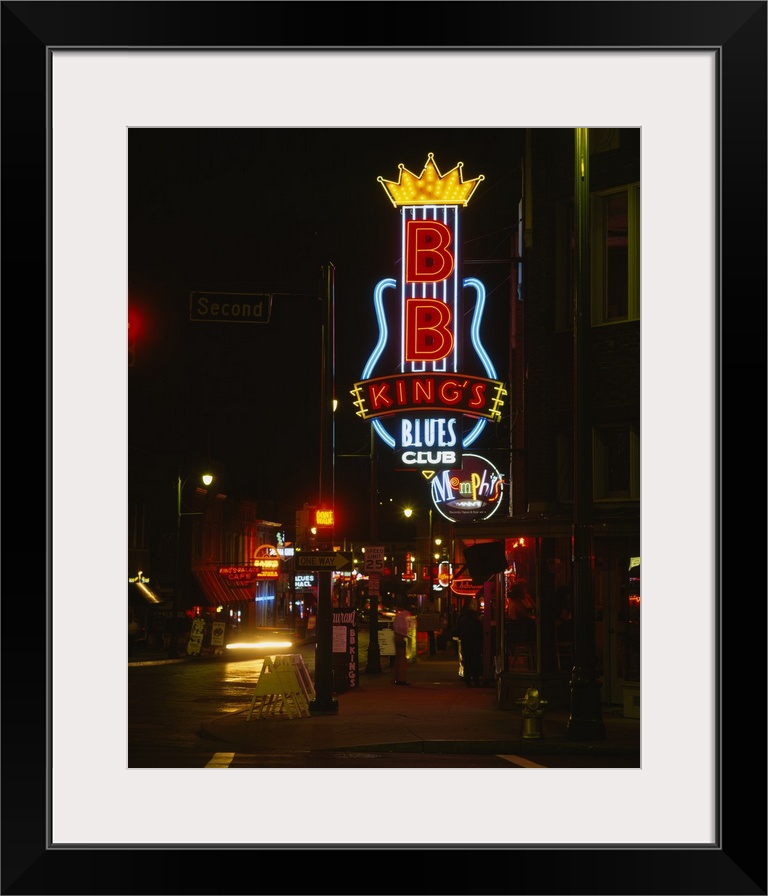<p>Vertical, large photograph of the street corner featuring the B.B. King's Blues Club neon sign, lit at night in Memphis, Tennessee.</p>