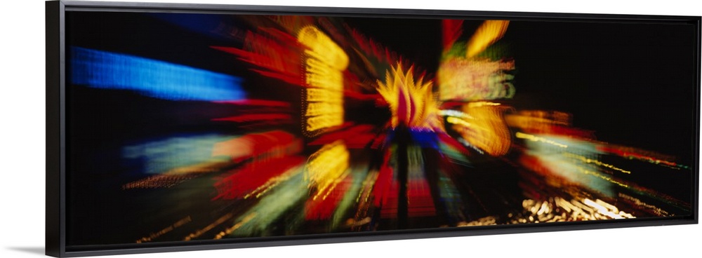 <p>Panoramic photograph of a large neon sign that is heavily blurred, at night in Las Vegas.</p>