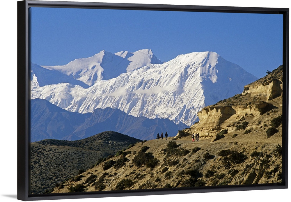 <p>Nepal, Himalaya, Mustang. Trekkers on the main Mustang trail with the Annapurna massif soaring on the horizon behind.</p>