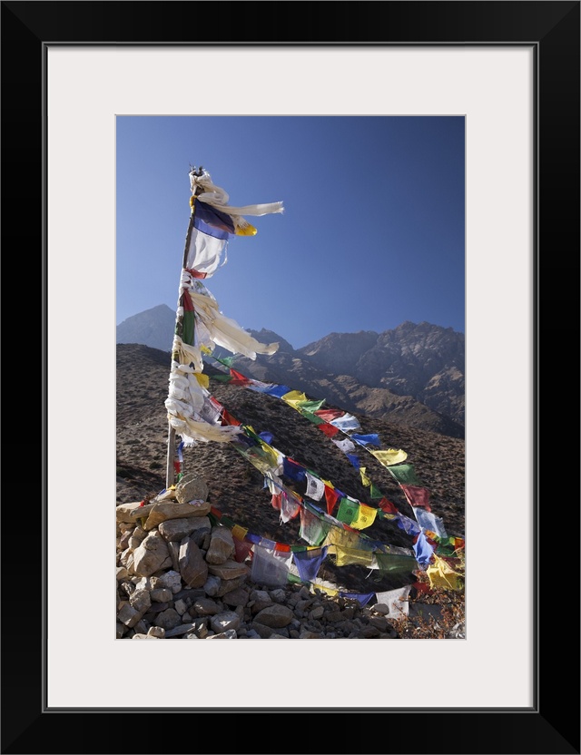 <p>Nepal, Mustang. Prayer flags fluttering at Dajori La Pass, high up above the village of Samar.</p>