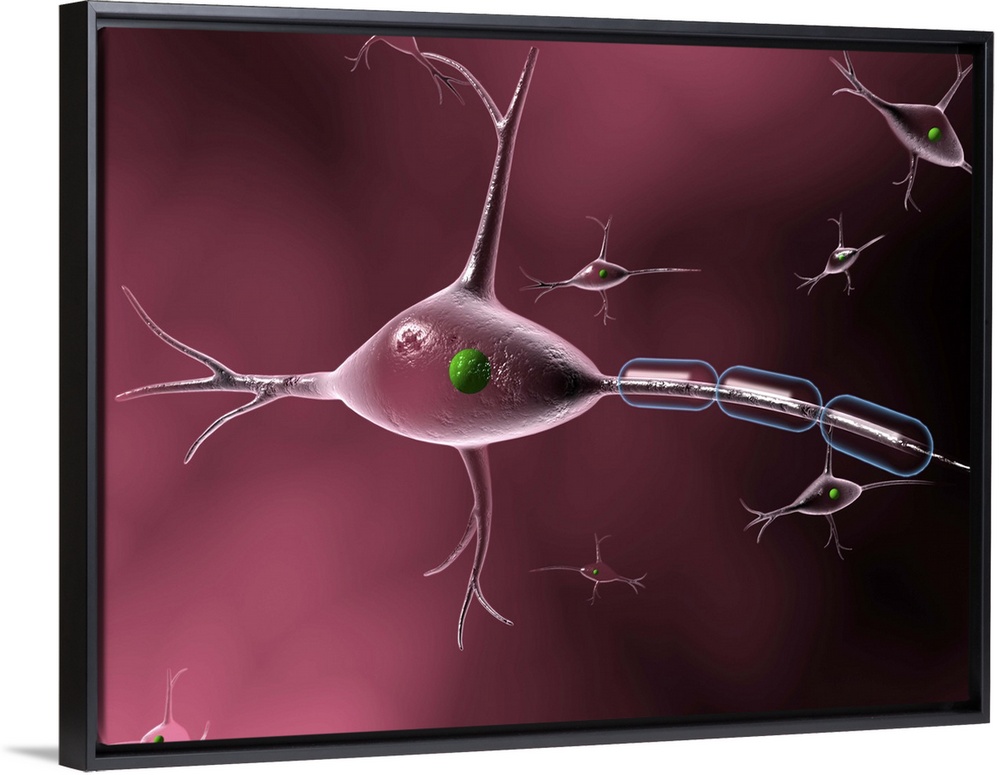 <p>Nerve cell. Computer artwork of a nerve cell or neuron. Other nerve cells are seen in the background. Neurons are responsible for passing information around the central nervous system (CNS) and from the CNS to the rest of the body. Each nerve cell comprises a body (circular) surrounded by numerous extensions called dendrites. Dendrites collect information from other nerve cells or from sensory cells. Each neuron also has one process called an axon, which passes information to other nerve cells, or to effector cells such as muscle fibres. This neuron's axon is covered with a myelin sheath (blue), an insulating fatty layer that increases the speed at which nerve impulses travel.</p>