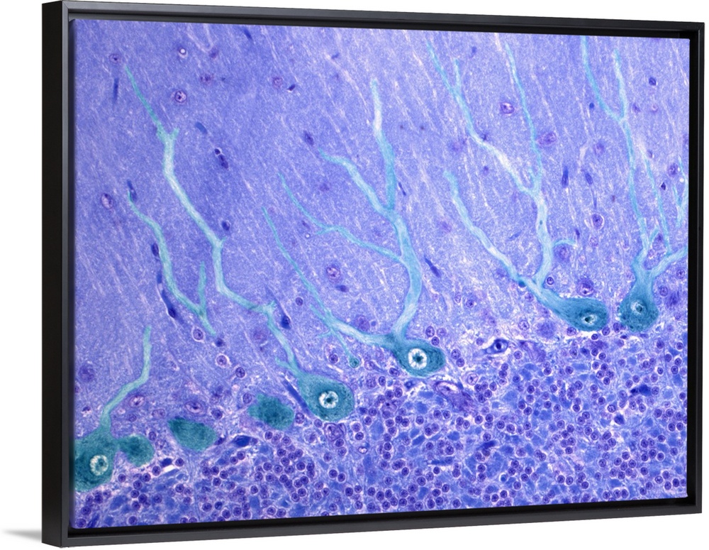 <p>Nerve cells. Light micrograph of Purkinje neurons (nerve cells, blue) in the cerebellum. These cells form the junction between the granular and molecular layers of the grey matter of the cerebellum. Magnification: x400 when printed at 10 centimetres wide.</p>