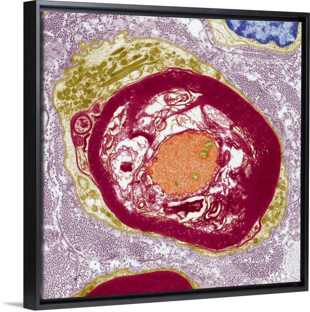 <p>Nerve demyelination. Coloured transmission electron micrograph (TEM) of a section through a Schwann cell and a nerve fibre, showing the early collapse of its myelin sheath. Myelin (red) is an insulating fatty layer that surrounds the nerve fibre (axon, orange), increasing the speed at which nerve impulses travel. It is formed when a Schwann cell (green) wraps around the fibre, depositing layers of myelin between each coil. Demyelination occurs in nerve disorders such as multiple sclerosis (MS). Patches (lesions) of myelin sheath are destroyed and nerve function is impaired. Magnification: x3800 when printed 10 centimetres wide.</p>