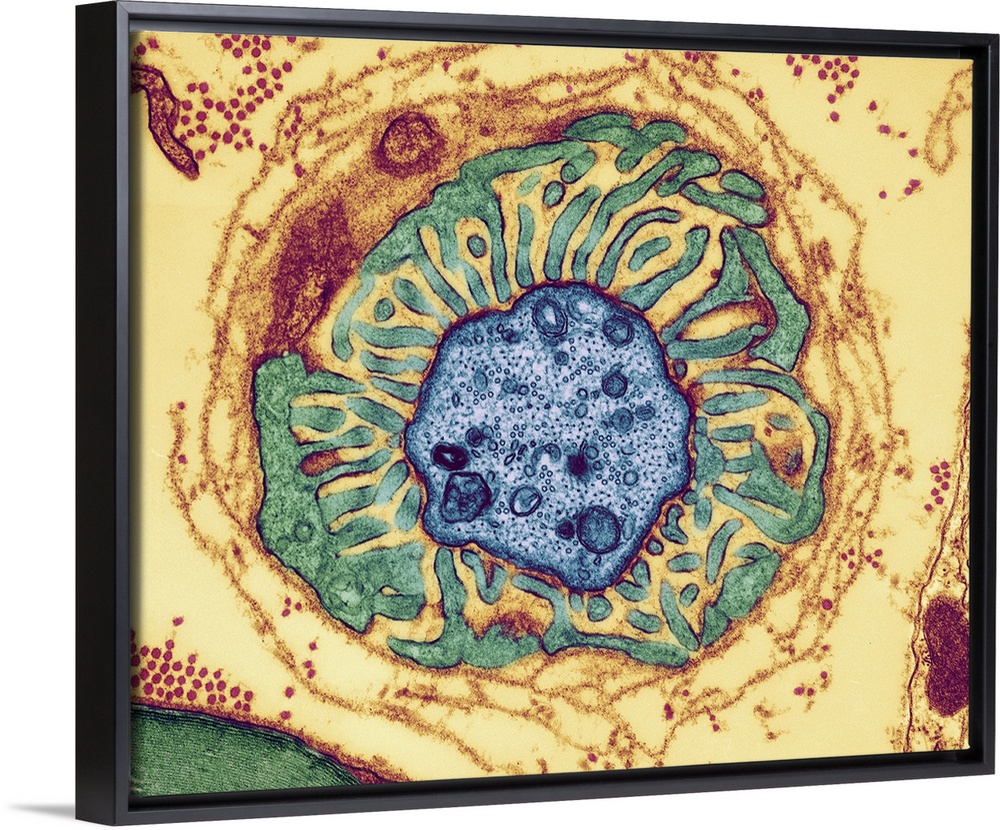 <p>Nerve fibre node. Coloured transmission electron micrograph (TEM) of a cross-section through a nerve fibre (axon) at a node of Ranvier. The axon (blue) is surrounded by a fatty insulating sheath of myelin (green), which increases the speed of the nerve signal. Nodes of Ranvier are areas of exposed axon, with a high concentration of sodium channels. Instead of travelling continuously along the length of the axon, the impulse jumps between these nodes in a process called saltatory conduction. This allows the impulse to travel over long distances.</p>