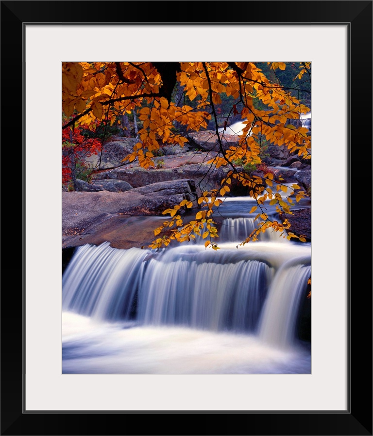<p>Fall scene with a waterfall under a branch full of orange leaves.</p>