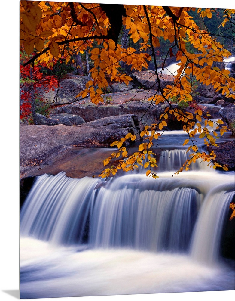 <p>Fall scene with a waterfall under a branch full of orange leaves.</p>