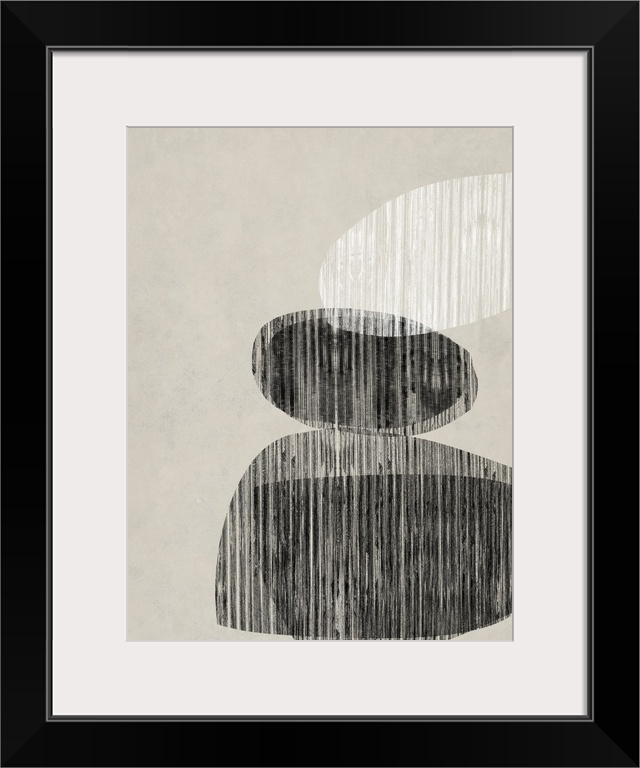 <p>Three rocks stacked on top of each other are decorated with vertical striations and dominate a neutral background.</p>