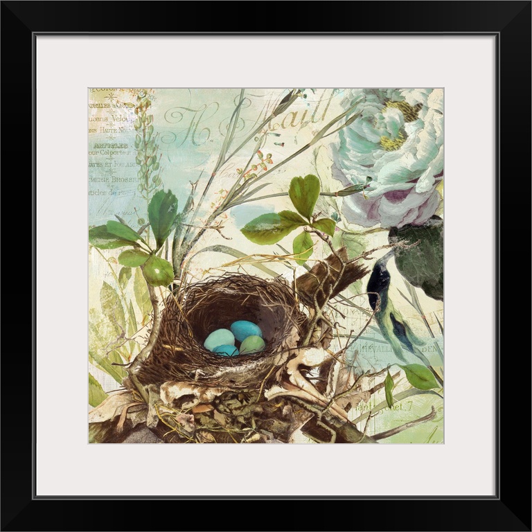 <p>Nest with robin's egg, flowers, vintage</p>