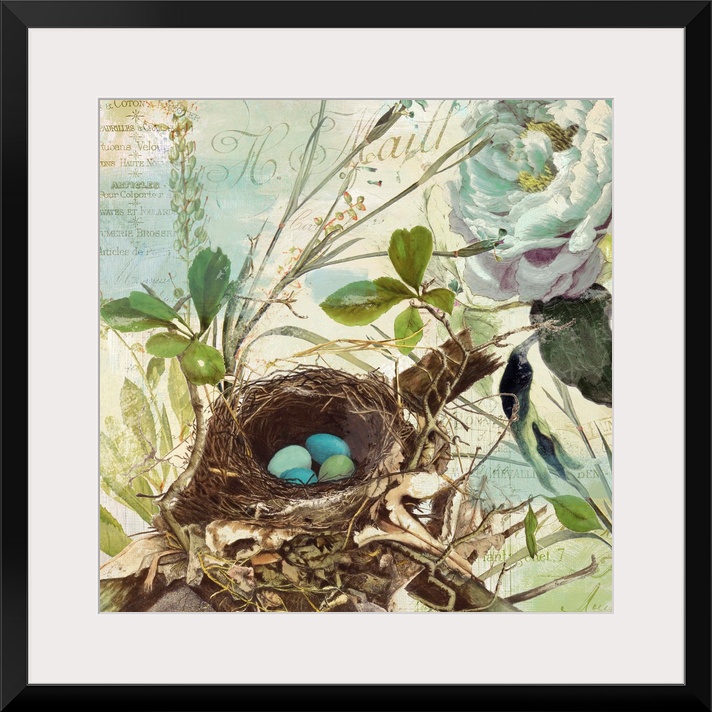 <p>Nest with robin's egg, flowers, vintage</p>