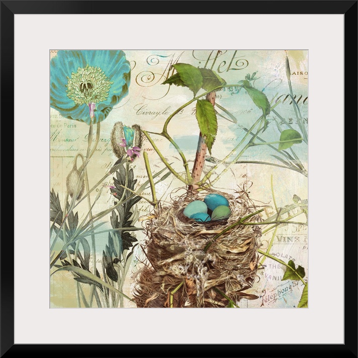 <p>Nest with robin's egg, flowers, postage, vintage</p>