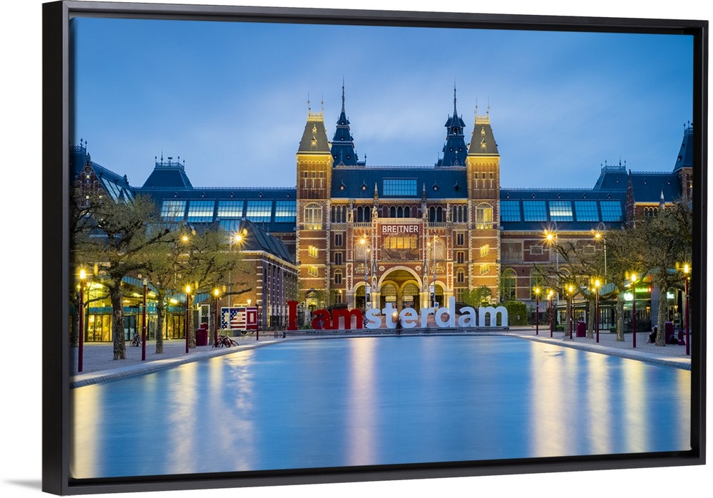 <p>Netherlands, North Holland, Amsterdam. The Rijksmuseum on Museumplein at dusk.</p>