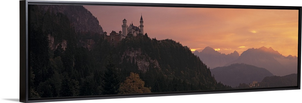 <p>A large panoramic piece of a castle sitting in the mountains in Germany. The sky has warm tones as the sun sets out of view.</p>