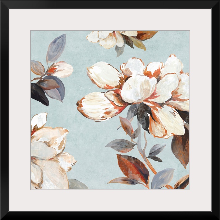 <p>A contemporary painting of white flower blooms on leaf covered branches against a neutral textured backdrop.</p>