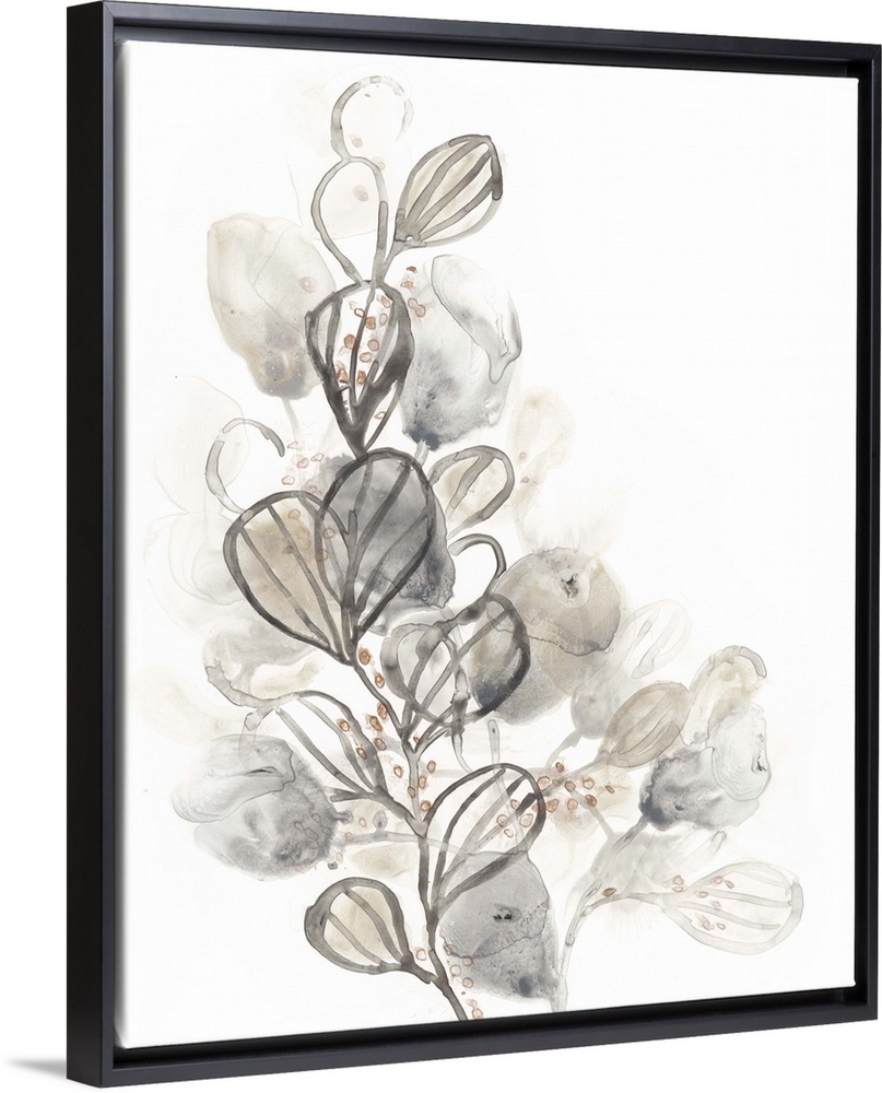 <p>Watercolor painting of leaves in muted neutral colors on white.</p>