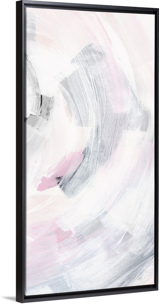 <p>Long vertical painting of curved brush strokes of white washed colors of pink, white and gray.</p>