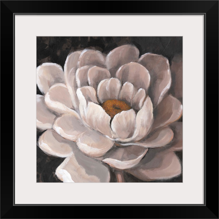 <p>Contemporary close-up painting of a white flower against a dark background.</p>