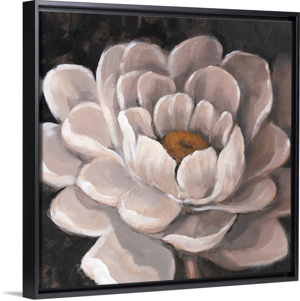 <p>Contemporary close-up painting of a white flower against a dark background.</p>