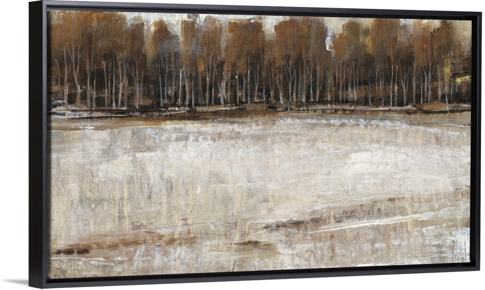 <p>Abstract landscape artwork of a forest at the edge of a lake in earth tones.</p>