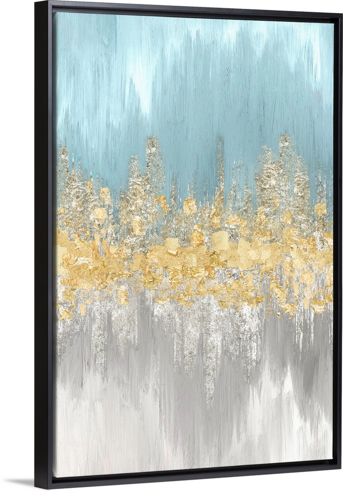 <p>Vertical painting with light blue on the top and gray on the bottom with textured gold in the center.</p>