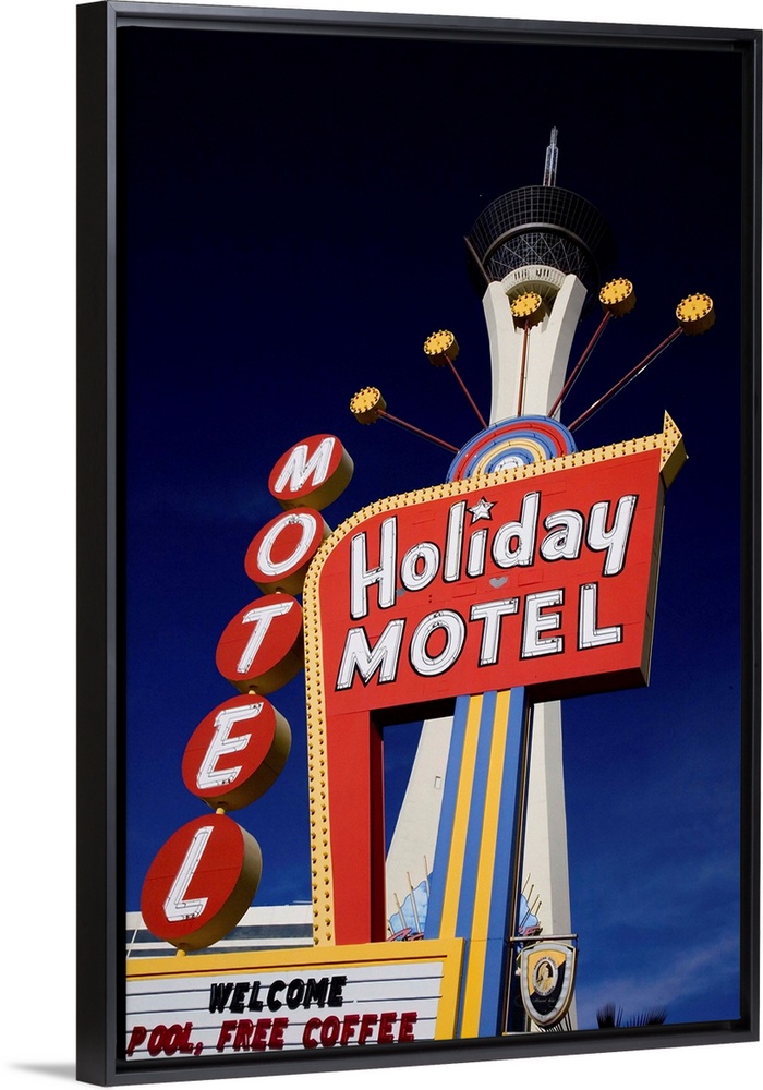 <p>United States, USA, Nevada, Las Vegas, Motel sign and Stratosphere Tower in background</p>