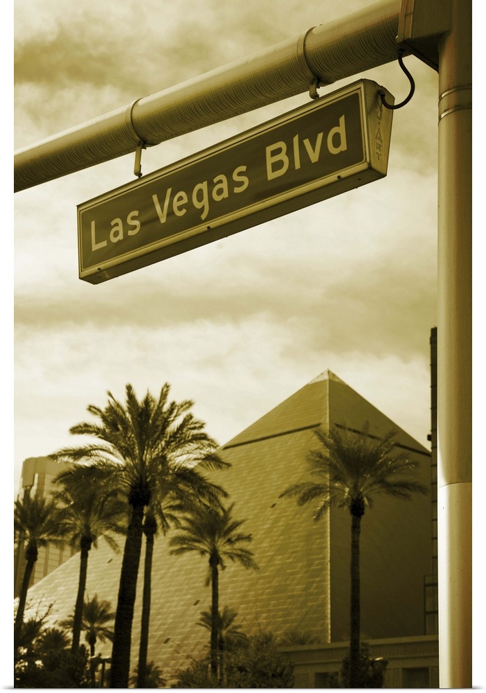 <p>United States, USA, Nevada, Las Vegas, Street name sign and Luxor Hotel and Casino</p>
