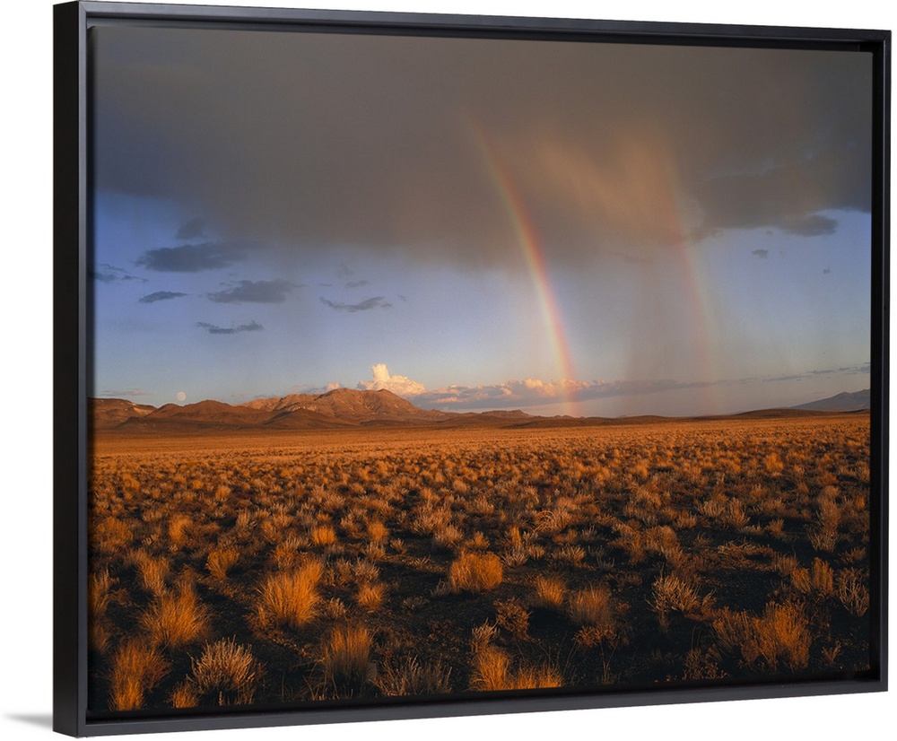 <p>The open desert is photographed largely with a storm in the background and a double rainbow shown.</p>