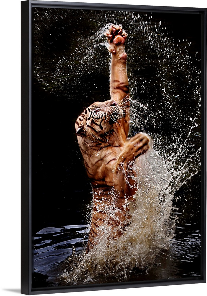 <p>A tiger leaping out of the water with paws outstretched.</p>