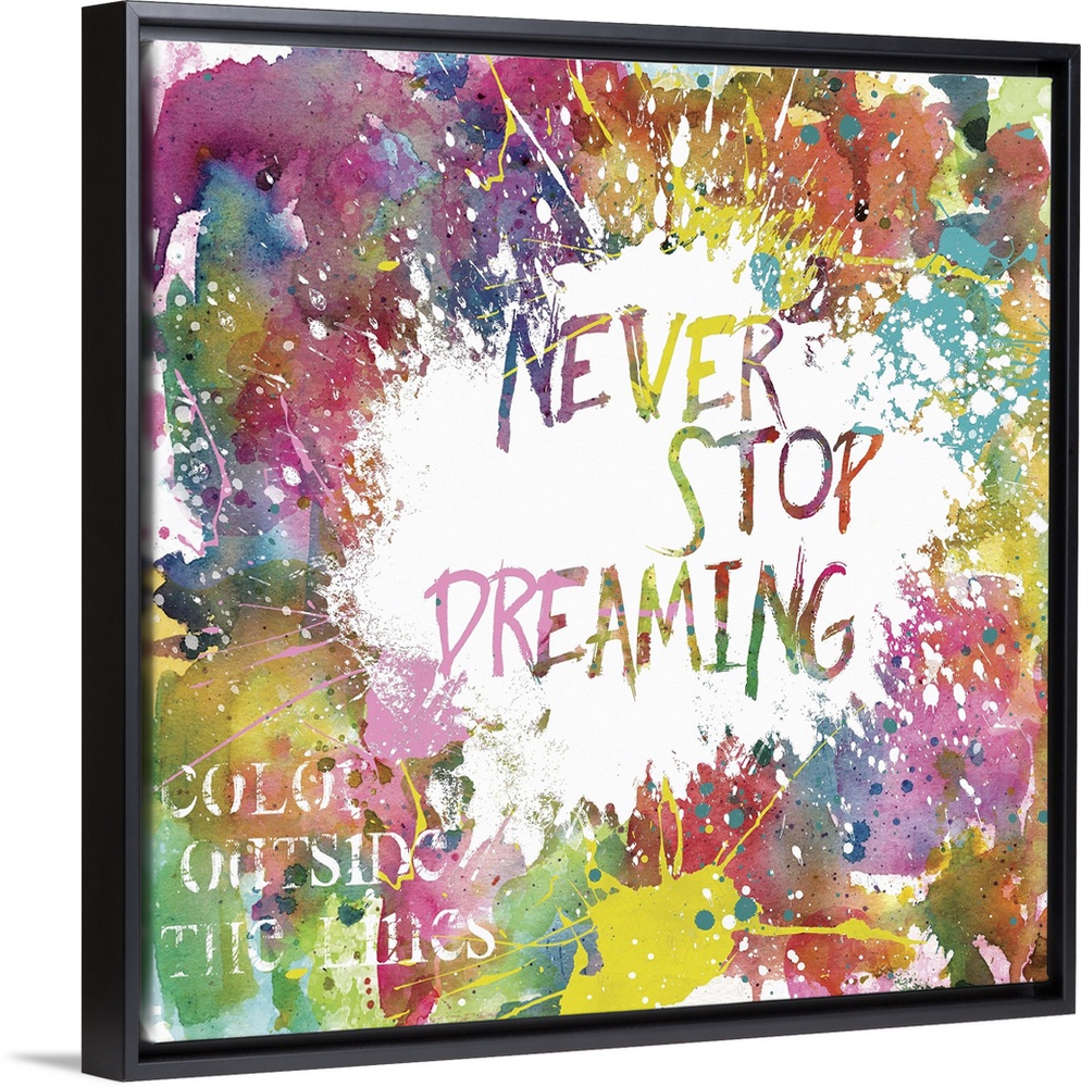 <p>Inspirational square painting with colorful paint splatter and the phrases "Never Stop Dreaming" and "Color Outside The Lines"</p>