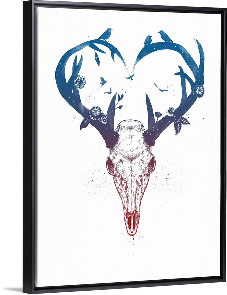 <p>Digital illustration of a deer skull with flowers and birds adorning its antlers.</p>