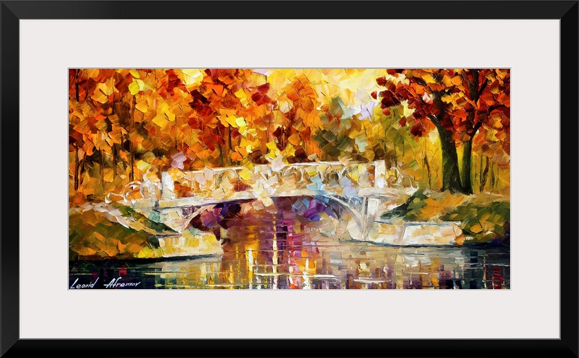 <p>Contemporary painting of a bridge over a stream in a forest with autumn foliage.</p>
