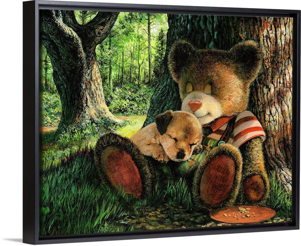 <p>A teddy bear sleeping against a tree in a forest with a puppy laying his lap.</p>