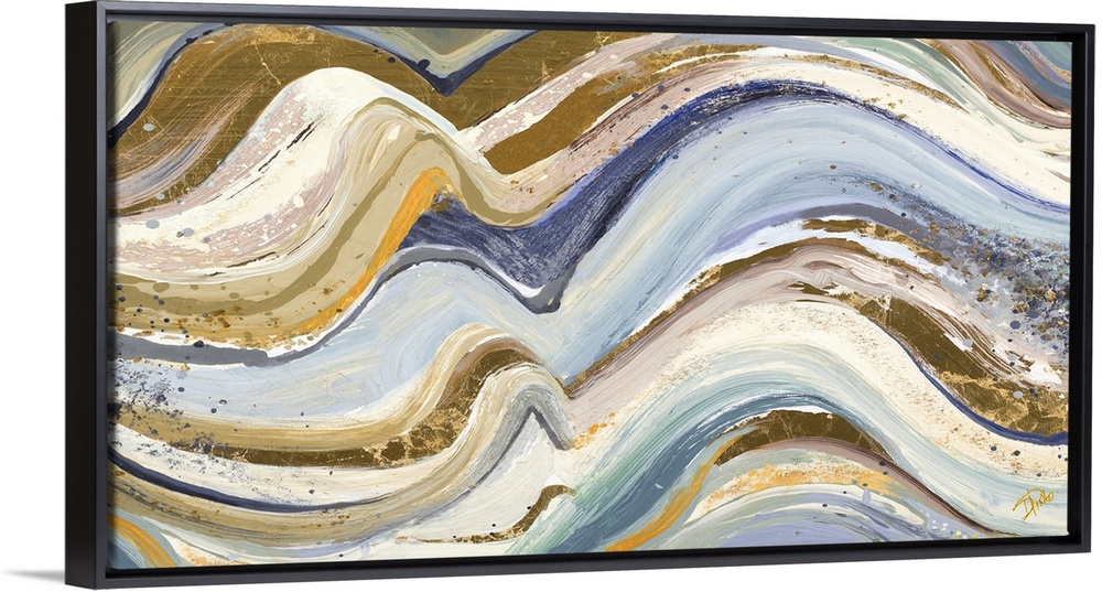 <p>Contemporary abstract painting with wavy lines piled on top of each other in shades of blue, tan, cream and gold with hints of green.</p>