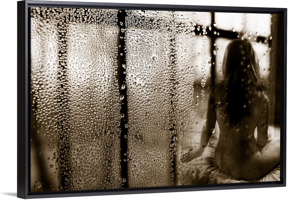 <p>A nude woman sitting on a bed, with lots of raindrops on the window.</p>