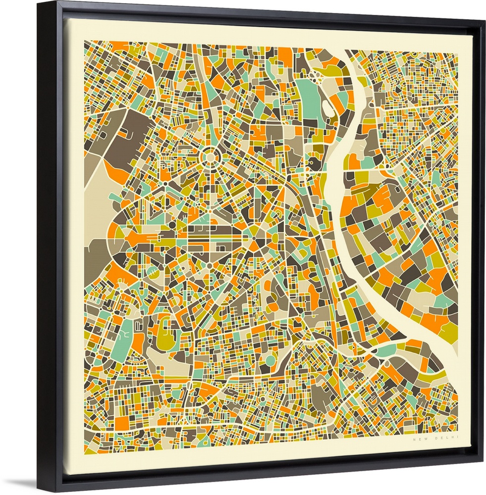 <p>Colorfully illustrated aerial street map of New Delhi, India on a square background.</p>