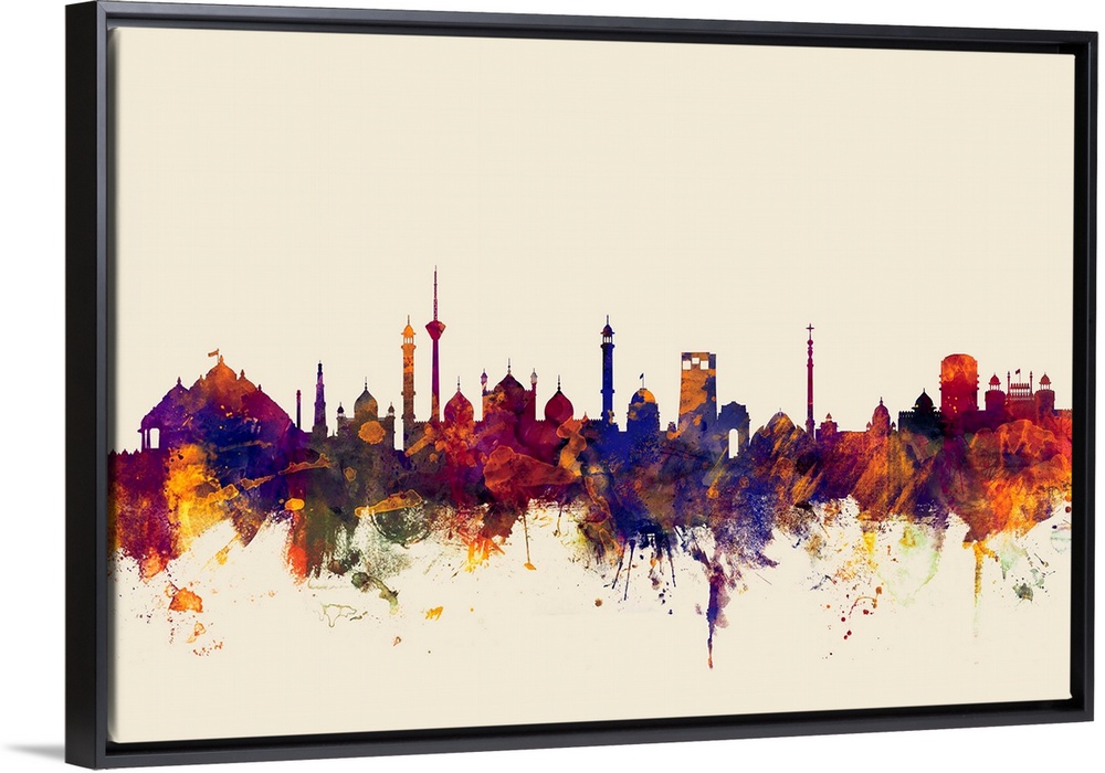 <p>Dark watercolor splattered silhouette of the New Delhi city skyline.</p>