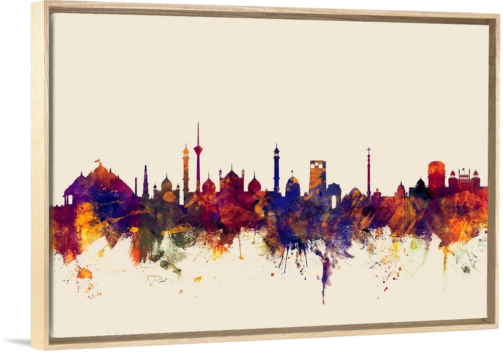 <p>Dark watercolor splattered silhouette of the New Delhi city skyline.</p>