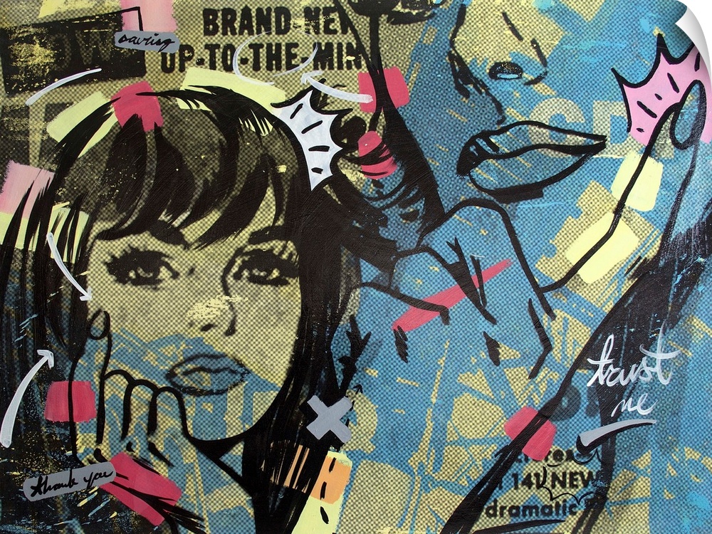 <p>Pop art composed of comic illustrations and bold text, reminiscent of Lichtenstein, of two women thinking with their hands on their chins.</p>