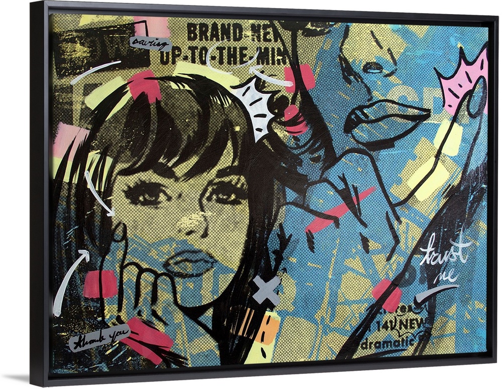 <p>Pop art composed of comic illustrations and bold text, reminiscent of Lichtenstein, of two women thinking with their hands on their chins.</p>