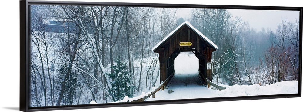 <p>A panoramic photograph of a one lane road through a covered bridge in a winter snowscape.</p>